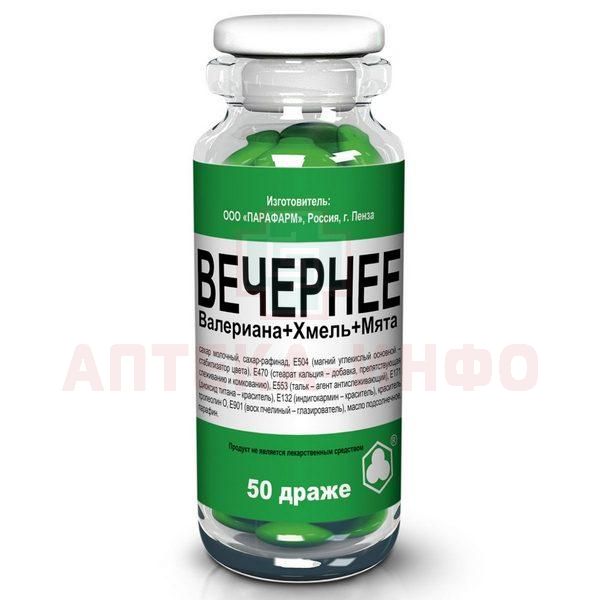 Благодаря природному комплексу веществ драже ВЕЧЕРНЕЕ обладает седативным, транквилизирующим, регулирующим сердечную деятельность и умеренными гипотензивными свойствами, является мягким спазмолитическим средством.