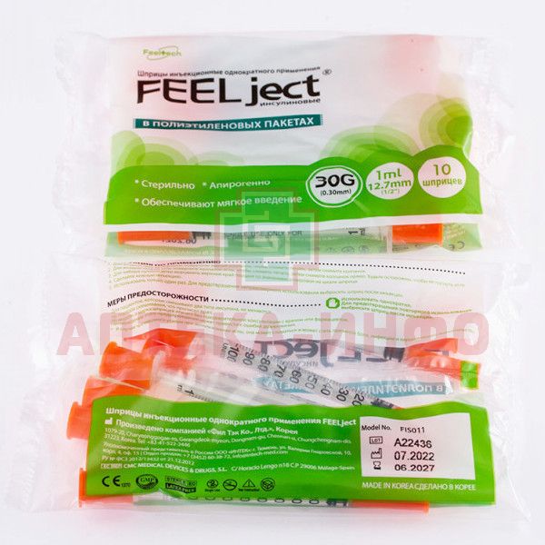 Шприц инсулиновый 1мл с интегр. иглой FEELject 30G (0,3х12,7мм) №10 Feel Tech/Корея
