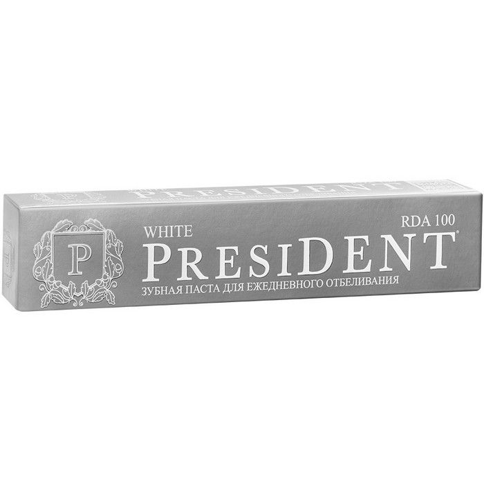 - Зубная паста PRESIDENT White c RDA 100* подходит для ежедневного отбеливания.