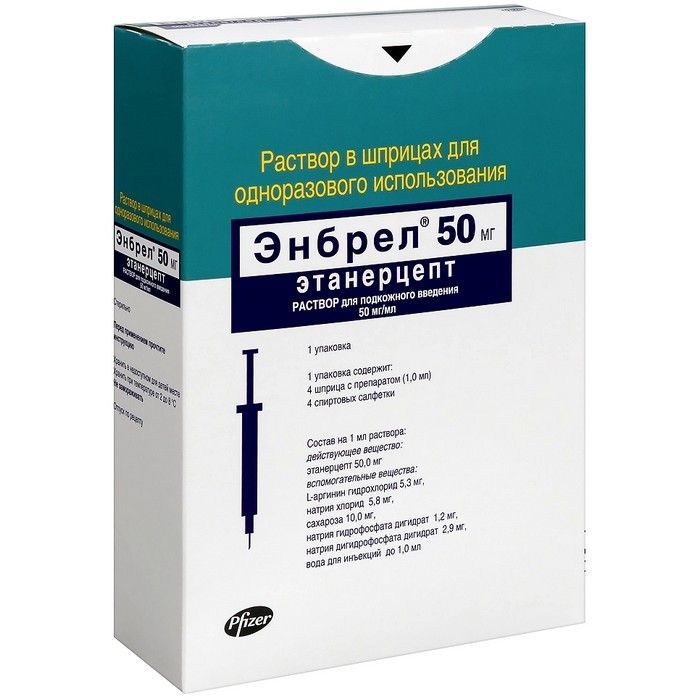 Энбрел шприц(р-р д/п/к введ.) 50мг/мл 1мл №4 + спирт. салфетки №4 Pfizer Ireland Pharmaceuticals/Ирландия/Pfizer/Бельгия