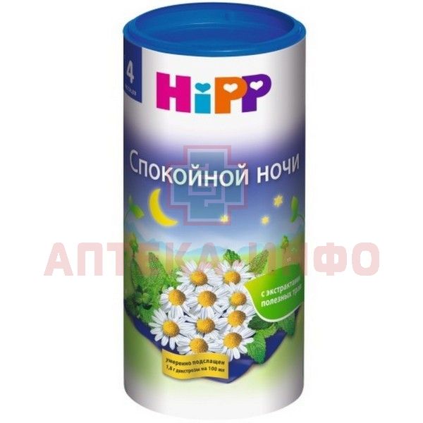 - Детский чай HiPP «Спокойной ночи» - это быстрорастворимый, легкий в приготовлении напиток с экстрактами мелиссы и ромашки для детей старше 4 месяцев.