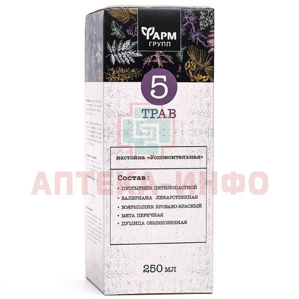 - НАСТОЙКА 5 ТРАВ УСПОКОИТЕЛЬНАЯ - Биологически активная добавка (БАД) к пище - проверенный временем рецепт, содержит экстракты пустырника, валерианы, боярышника, мяты, душицы. Применяется при проблемах со сном, нервных расстройствах, повышенном давлении.