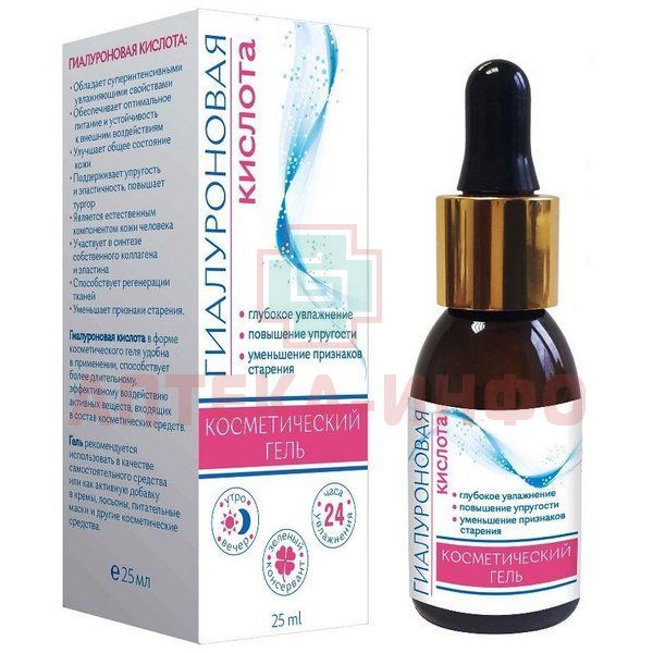 - ГИАЛУРОНОВАЯ КИСЛОТА ГЕЛЬ КОСМЕТИЧЕСКИЙ - в форме косметического геля удобна в применении, способствует более длительному, эффективному воздействию активных веществ, входящих в состав косметических средств.