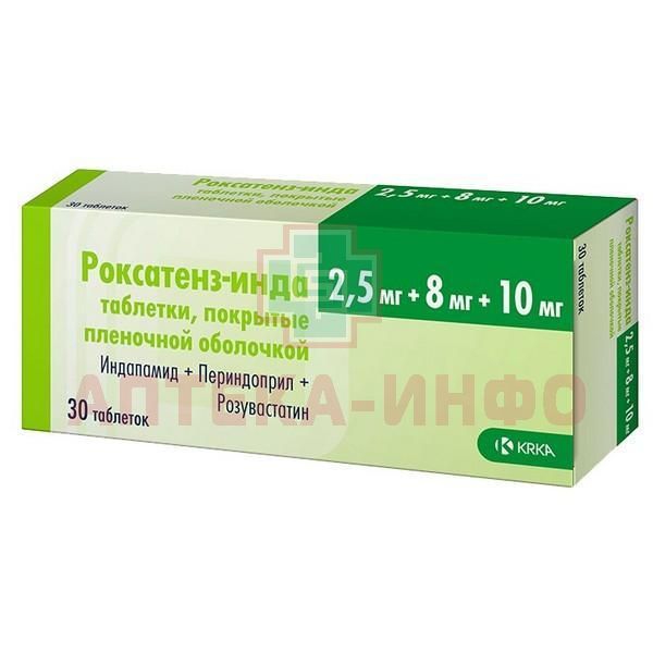 - Роксатенз-инда - комбинированный препарат, содержащий периндоприл - ингибитор ангиотензинпревращающего фермента (АПФ), индапамид - тиазидоподобный диуретик и розувастатин - селективный, конкурентный ингибитор ГМГ-КоА-редуктазы (статин). Механизм действия препарата основан на фармакологических свойствах каждого из действующих веществ и аддитивного синергического действия периндоприла и индапамида.